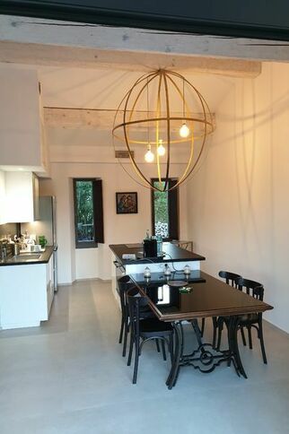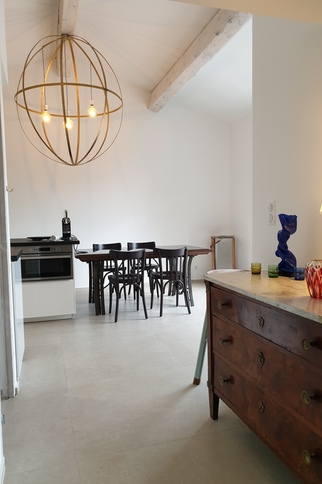 La cuisine est ouverte sur la salle à manger et la terrasse/jardin.