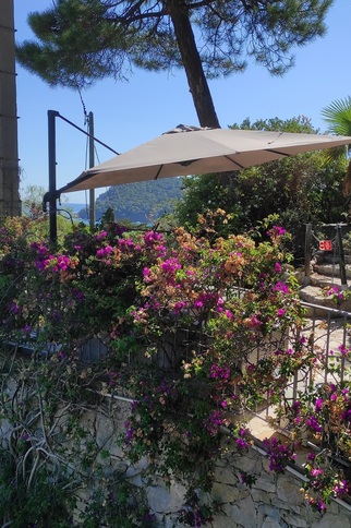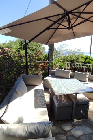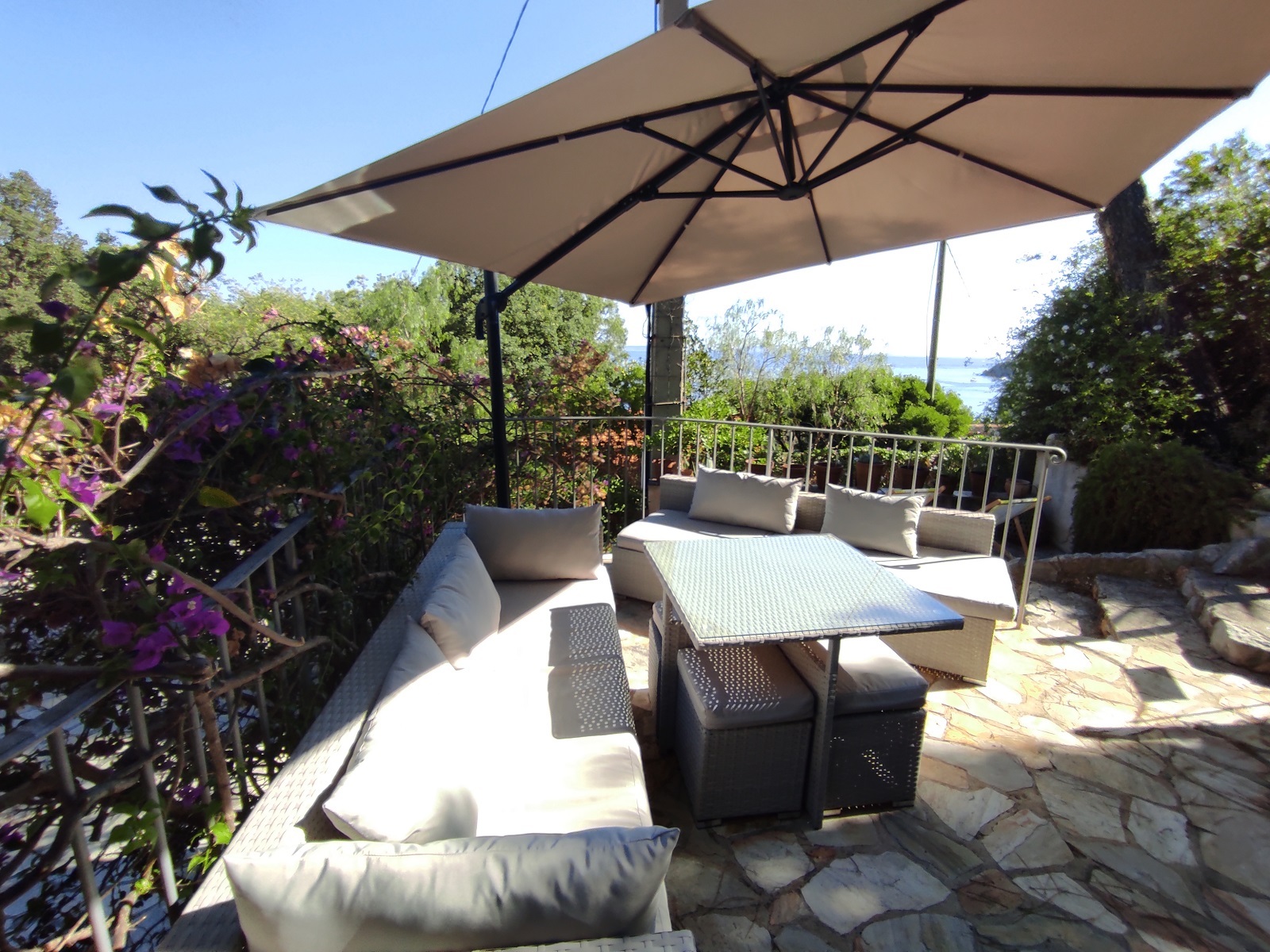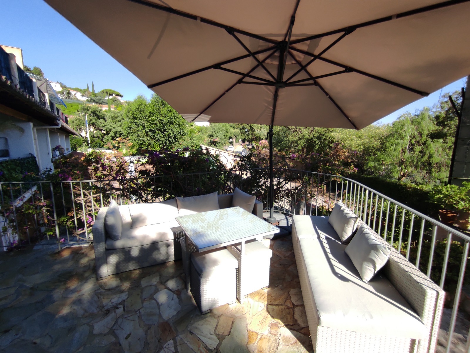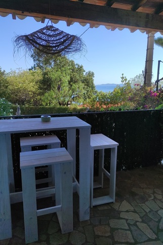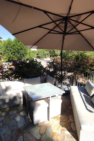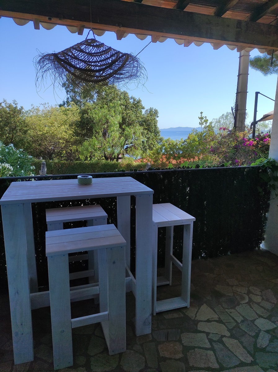 Après avoir gravi quelques marches, l'appartement de 60m² est accessible par une grande terrasse avec vue mer sur les îles d'Or et le Cap Nègre.
