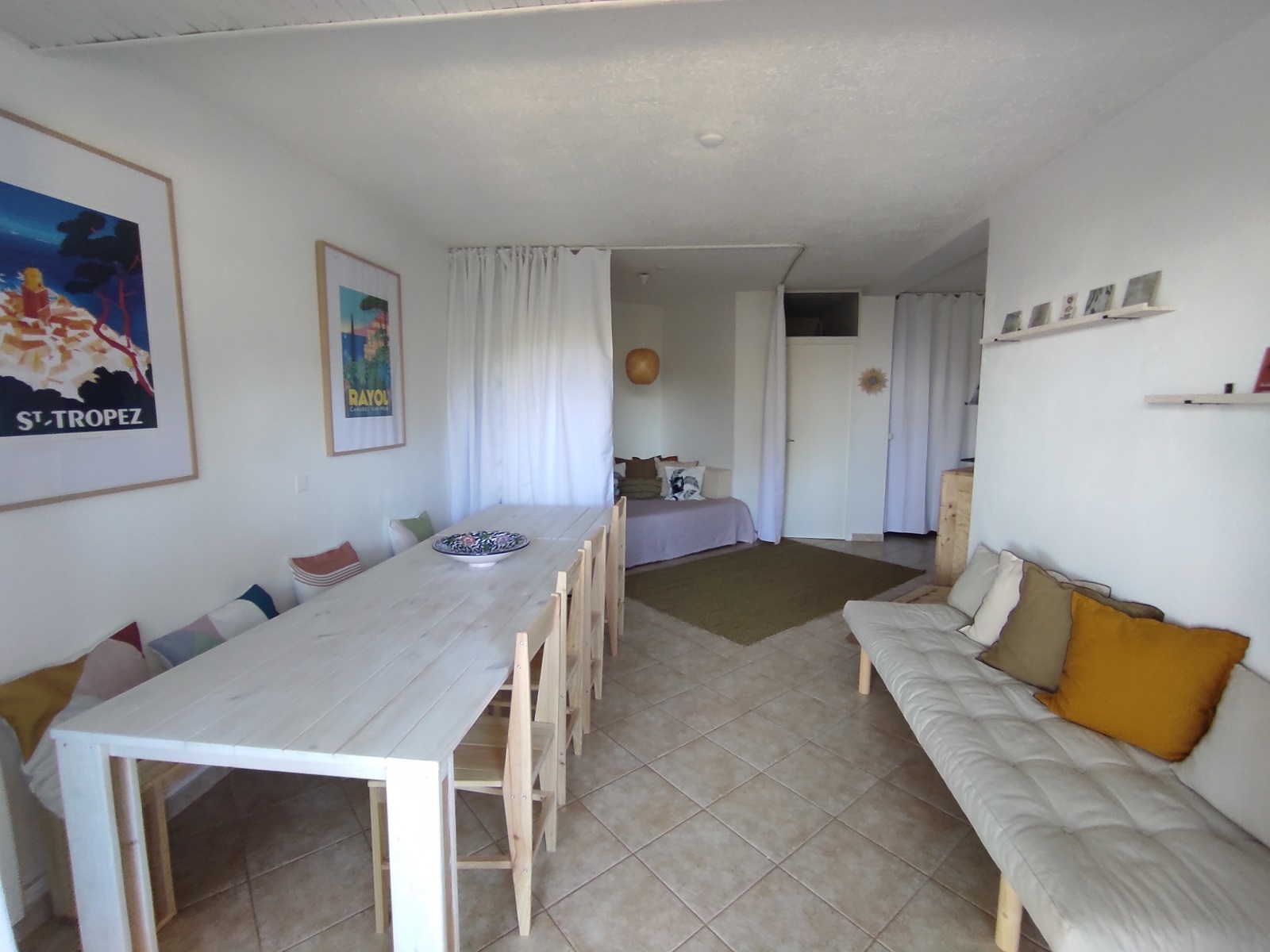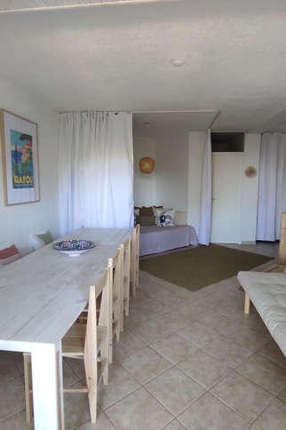 Il offre une pièce de vie avec salle à manger, méridienne et un coin nuit avec un lit 2 places (140 cm, matelas neuf) séparé par des rideaux occultants avec des rangements.