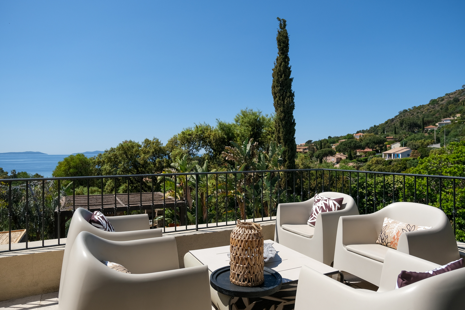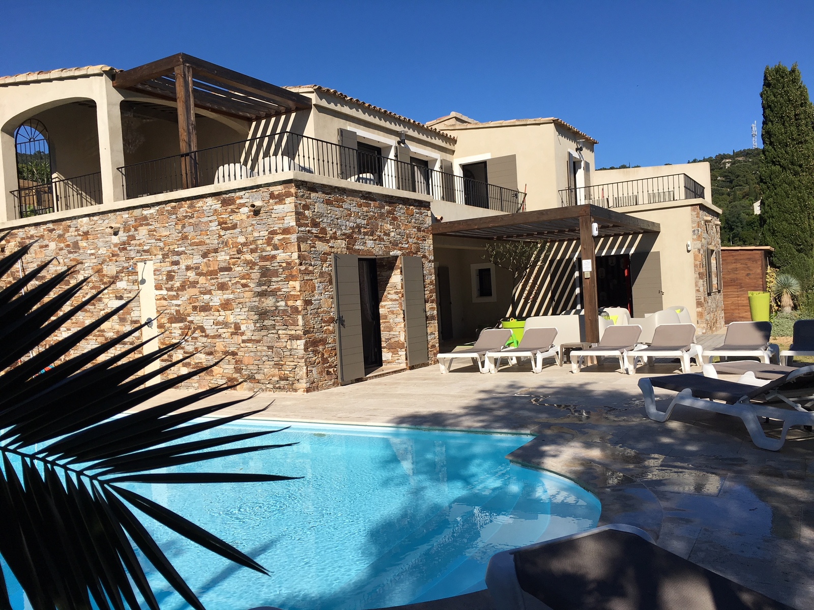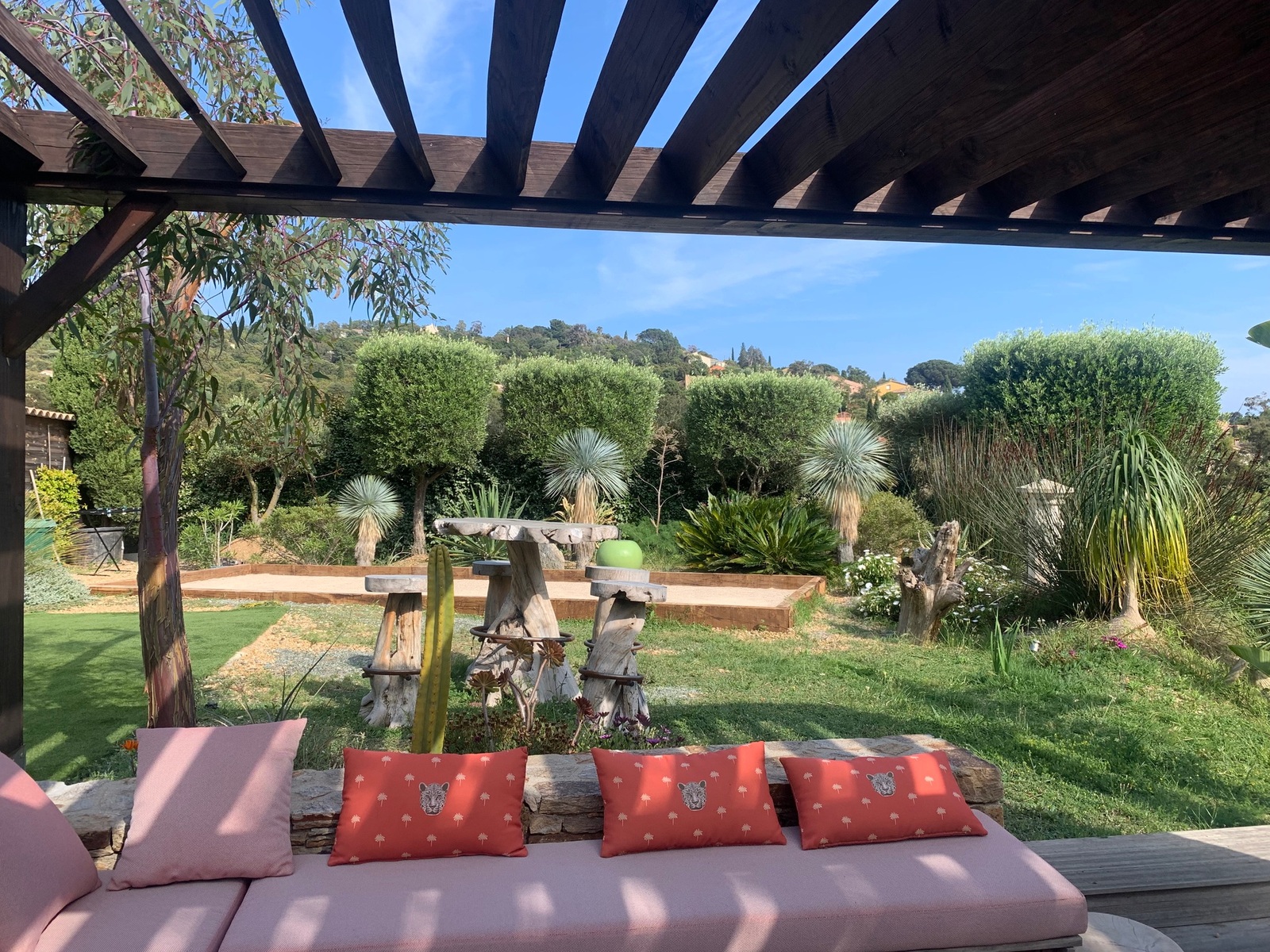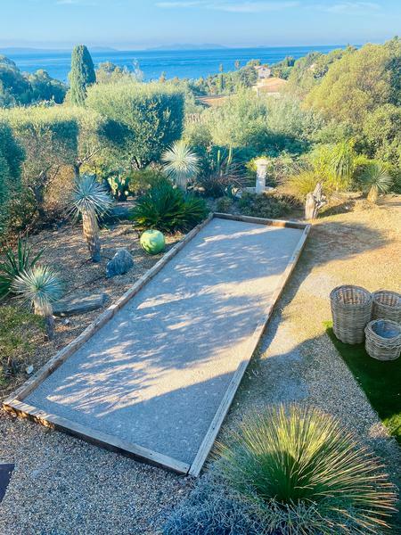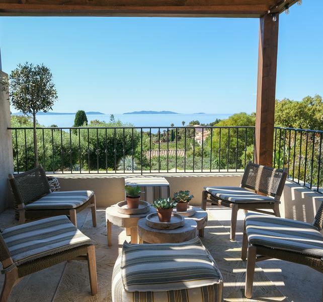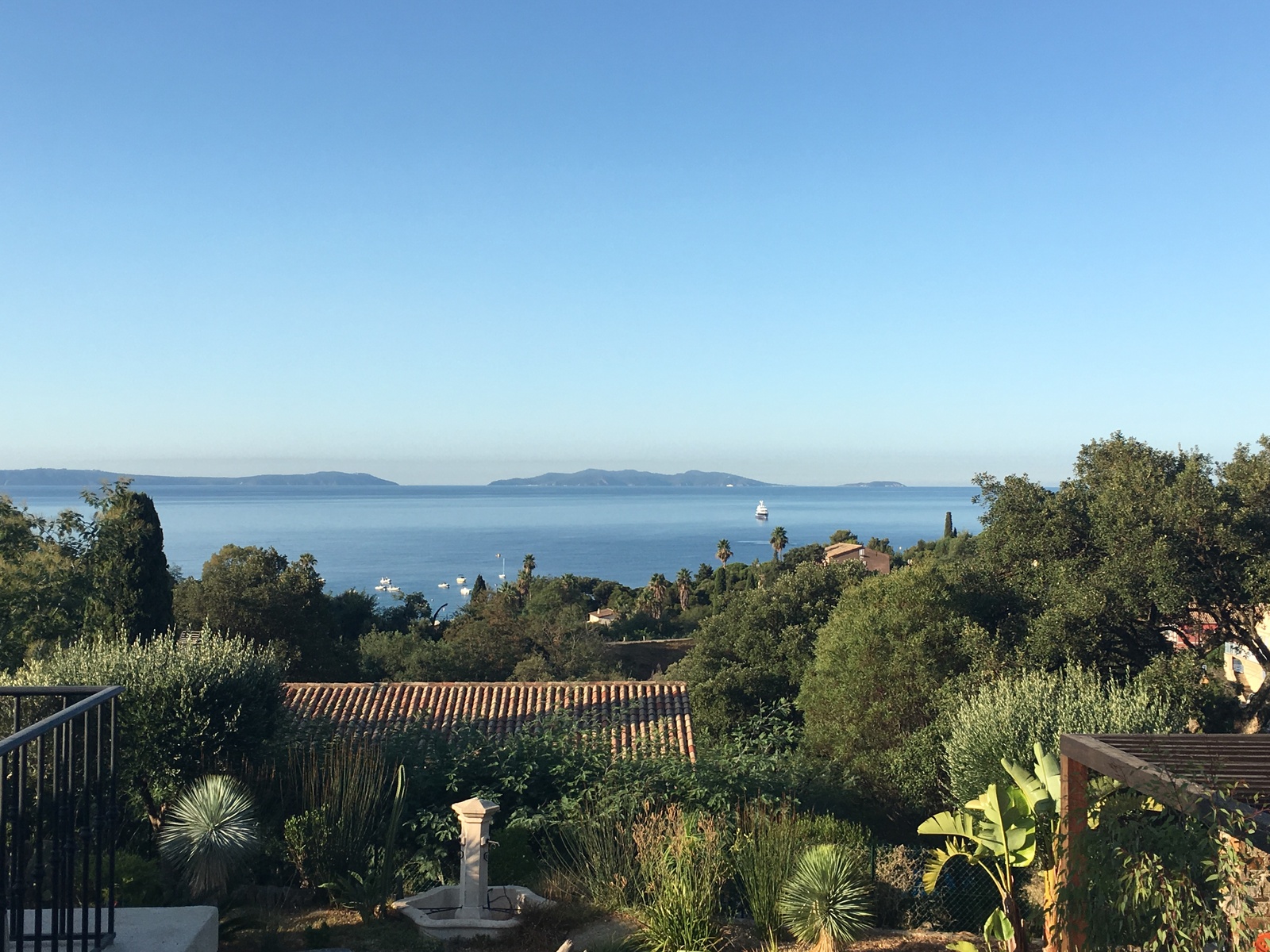 Villa au calme entièrement rénovée intérieur et extérieur, jardin paysager méditerranéen de 1000 m2, un pool house avec bar, canapés, réfrigérateur, évier, plancha, grande piscine à débordement équipée de 10 relax et 3 autres terrasses et patios équipés de fauteuils et canapés, terrain de pétanque, espace sieste.Vue imprenable sur la mer, face aux Iles d'Or (Levant, Port Cros) et sur la colline du massif des Maures. Idéalement située sans vis à vis à 300m d'une petite plage protégée avec bar, restaurant, location de matelas.