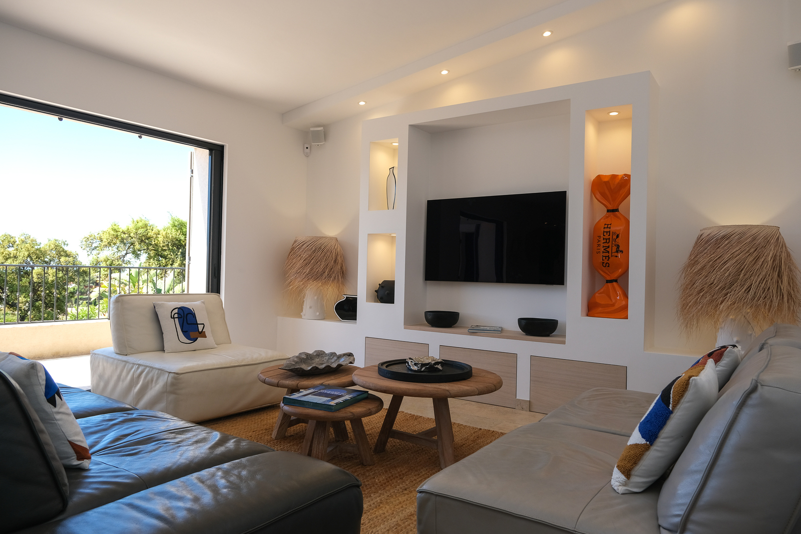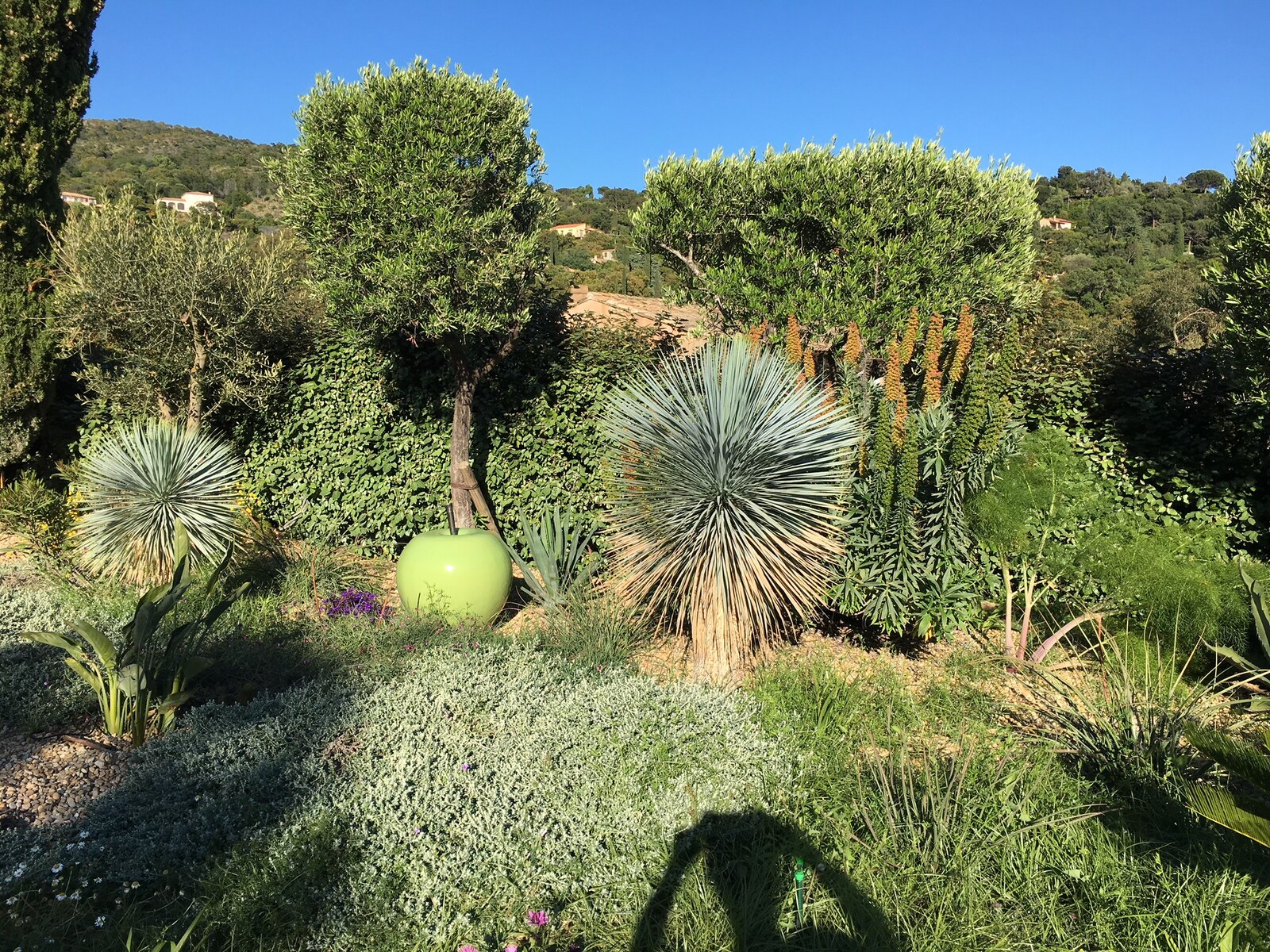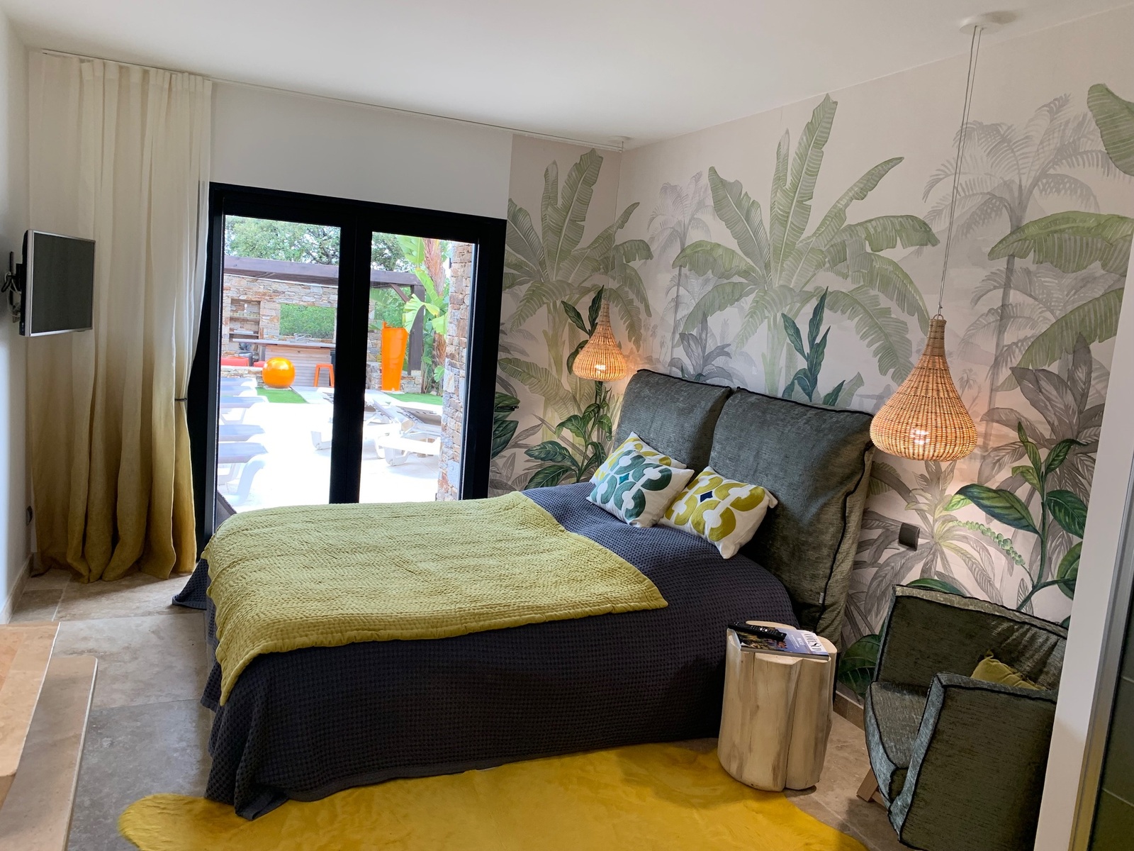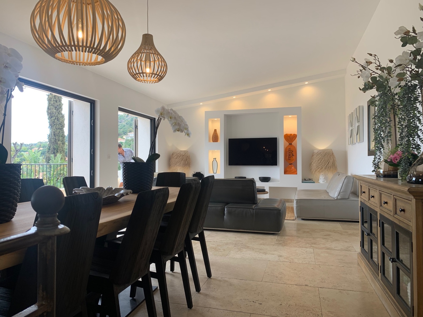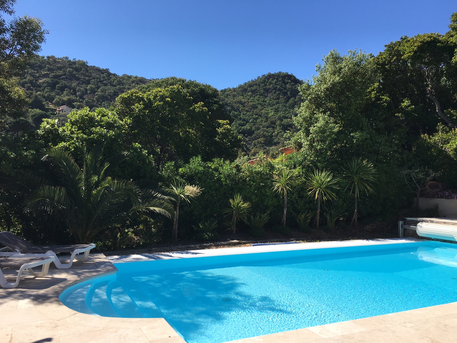 Villa au calme entièrement rénovée intérieur et extérieur, jardin paysager méditerranéen de 1000 m2, un pool house avec bar, canapés, réfrigérateur, évier, plancha, grande piscine à débordement équipée de 10 relax et 3 autres terrasses et patios équipés de fauteuils et canapés, terrain de pétanque, espace sieste.Vue imprenable sur la mer, face aux Iles d'Or (Levant, Port Cros) et sur la colline du massif des Maures. Idéalement située sans vis à vis à 300m d'une petite plage protégée avec bar, restaurant, location de matelas.