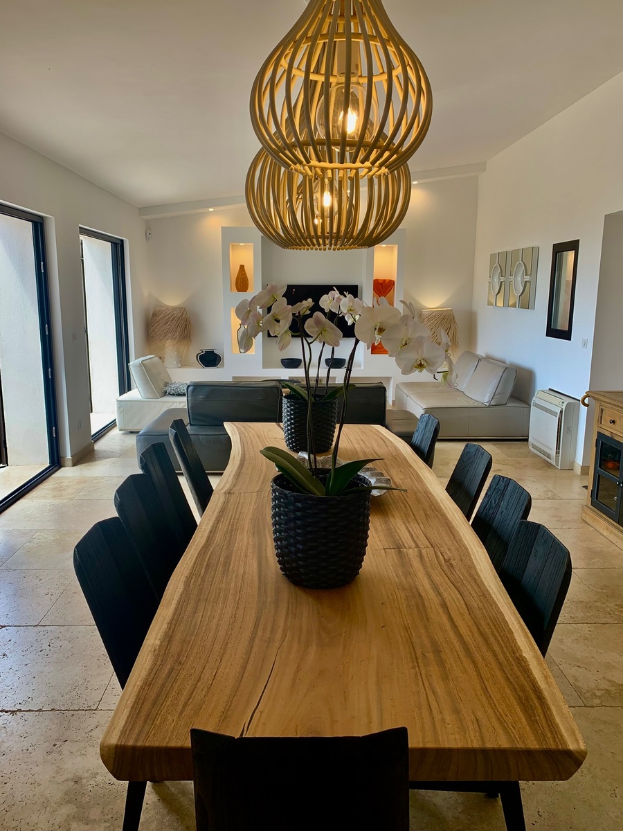 Maison de 210 m2 extrêmement confortable , décorée avec goût et parfaitement équipée, idéale pour recevoir une grande famille ou plusieurs couples avec enfants: 6 chambres dont 1 master bedroom avec salle d'eau intégrée, 3 chambres doubles, 1 chambre avec 2 lits simples et 1 dortoir enfants équipés de 4 lits, 5 salles de bains avec WC, salle à manger intérieure et extérieure, salon intérieur et plusieurs salons extérieurs. Parking fermé pour 3 voitures.
