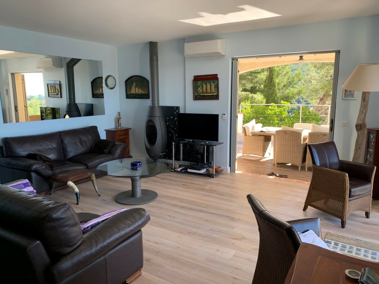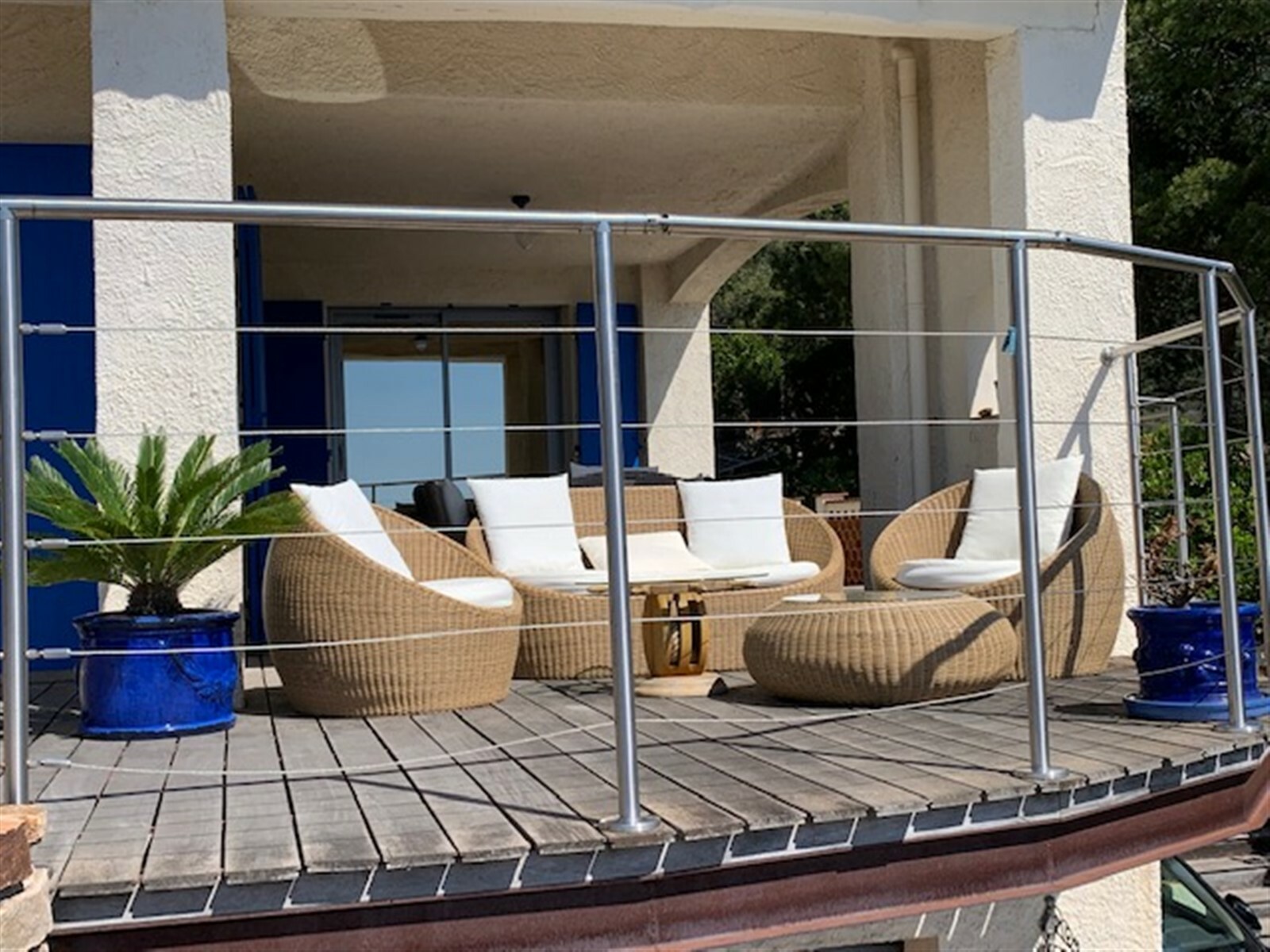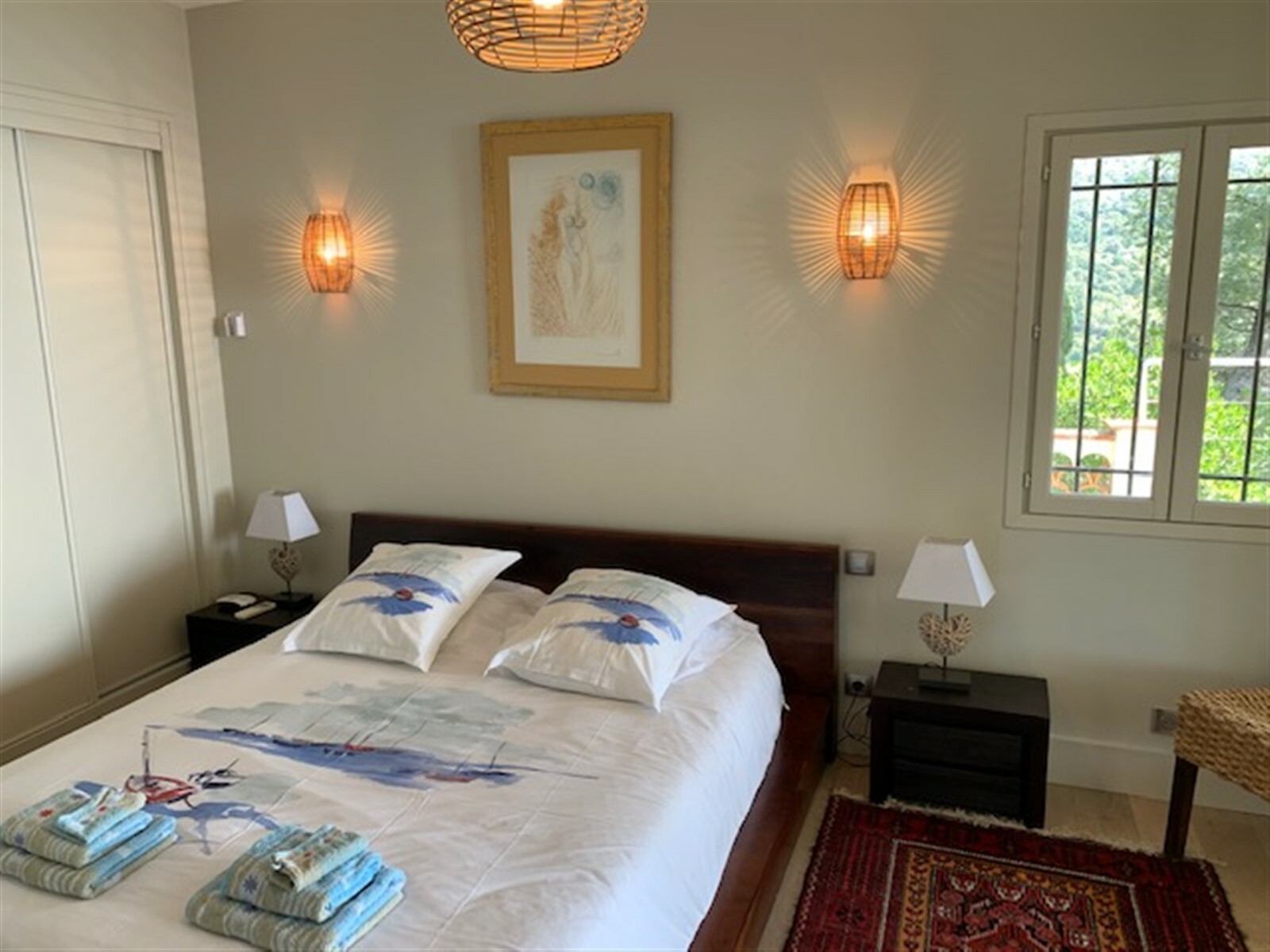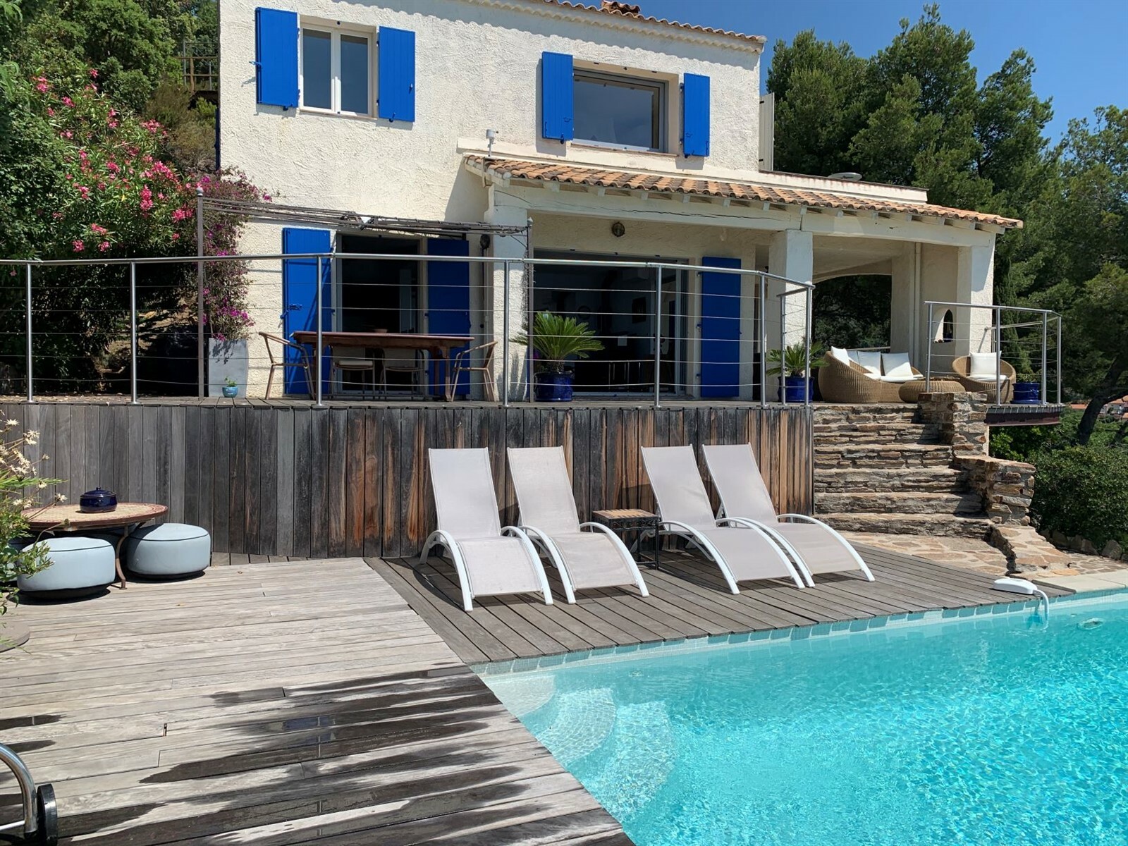 Située au calme dans une impasse.180m², exposée Sud, sur 2100m² de colline boisée, grande terrasse et solarium, pas de vis-à-vis, proximité plage (400m, 800m par route).