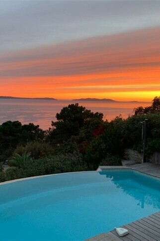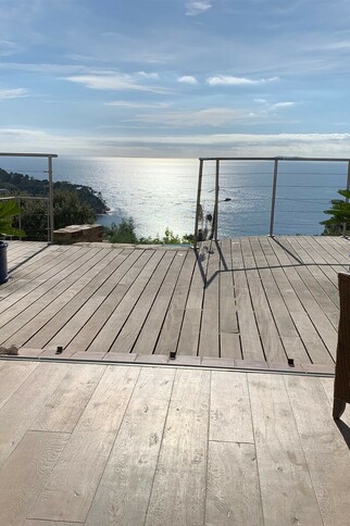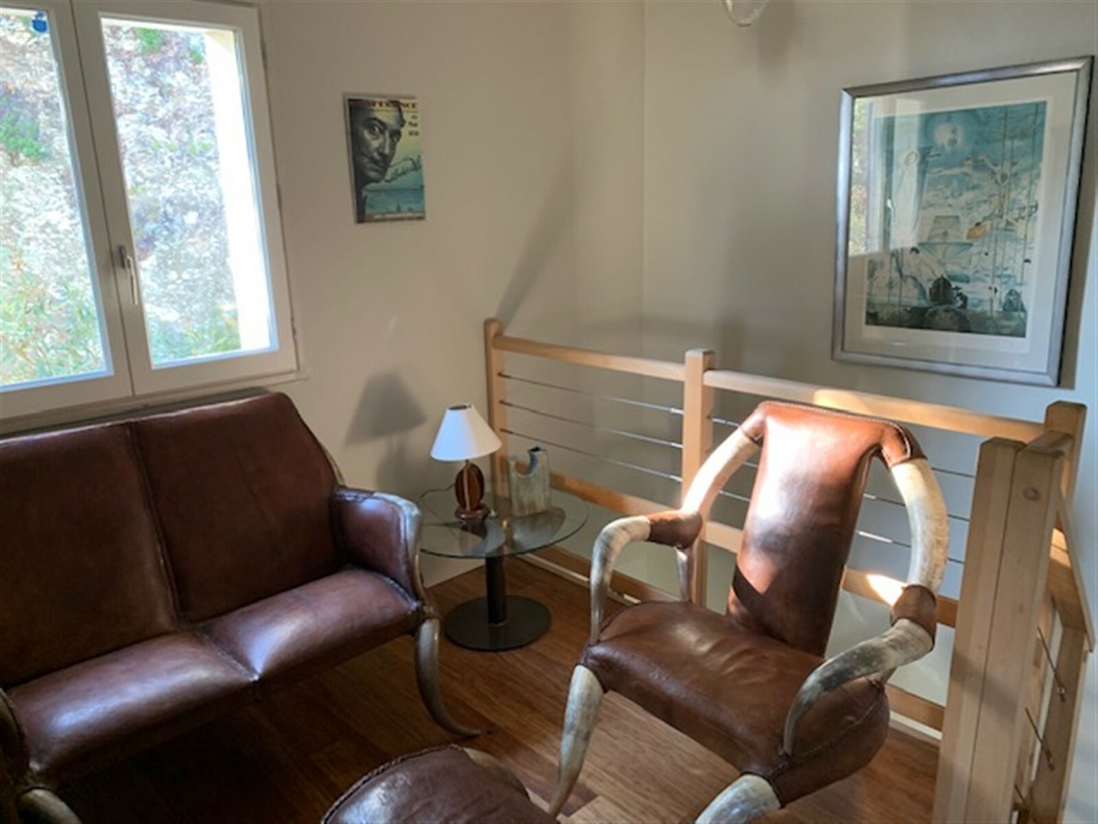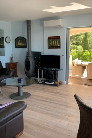180m², exposée Sud, sur 2100m² de colline boisée, grande terrasse et solarium, pas de vis-à-vis, proximité plage (400m, 800m par route).
