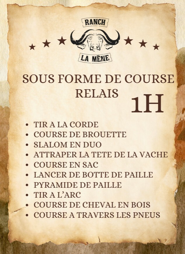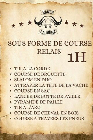 1h de Olympiade (tir à la corde, course de brouette, slalom en duo, attraper la tête de la vache, course en sac, lancer de botte de paille, tir à l'arc, course de cheval en bois, course à travers les pneus).
