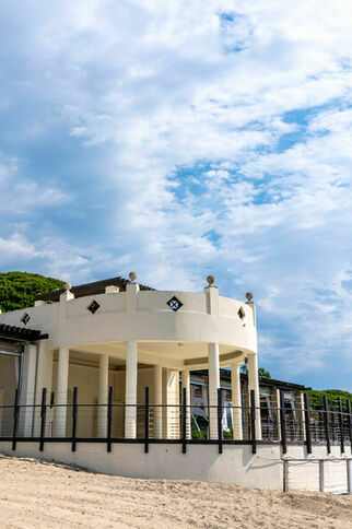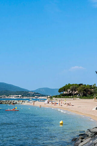 Large anse de sable abritée de la circulation et protégée de la vue des habitations par une haie naturelle de pins. Suivre la digue sur la gauche : un 'temple' grec donne un autre cachet à cette plage de la Côte d'Azur.