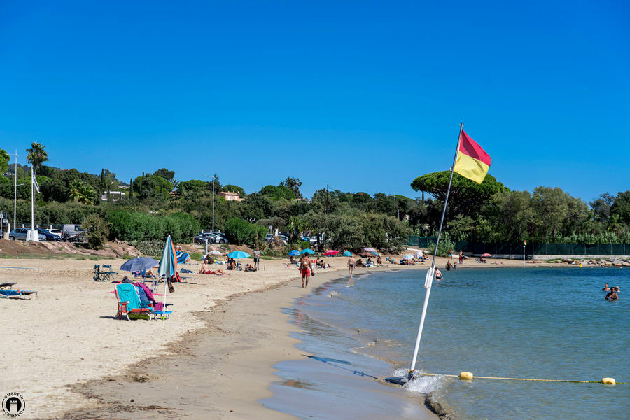 Jolie petite plage entourée de digues avec vue imprenable sur la citadelle de Saint-Tropez.