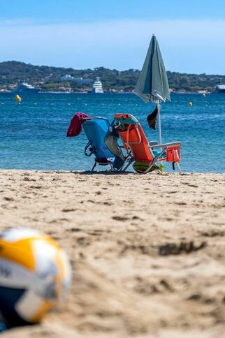 Jolie petite plage de la Côte d'Azur entourée de digues avec vue imprenable sur la citadelle de Saint-Tropez. En période estivale :