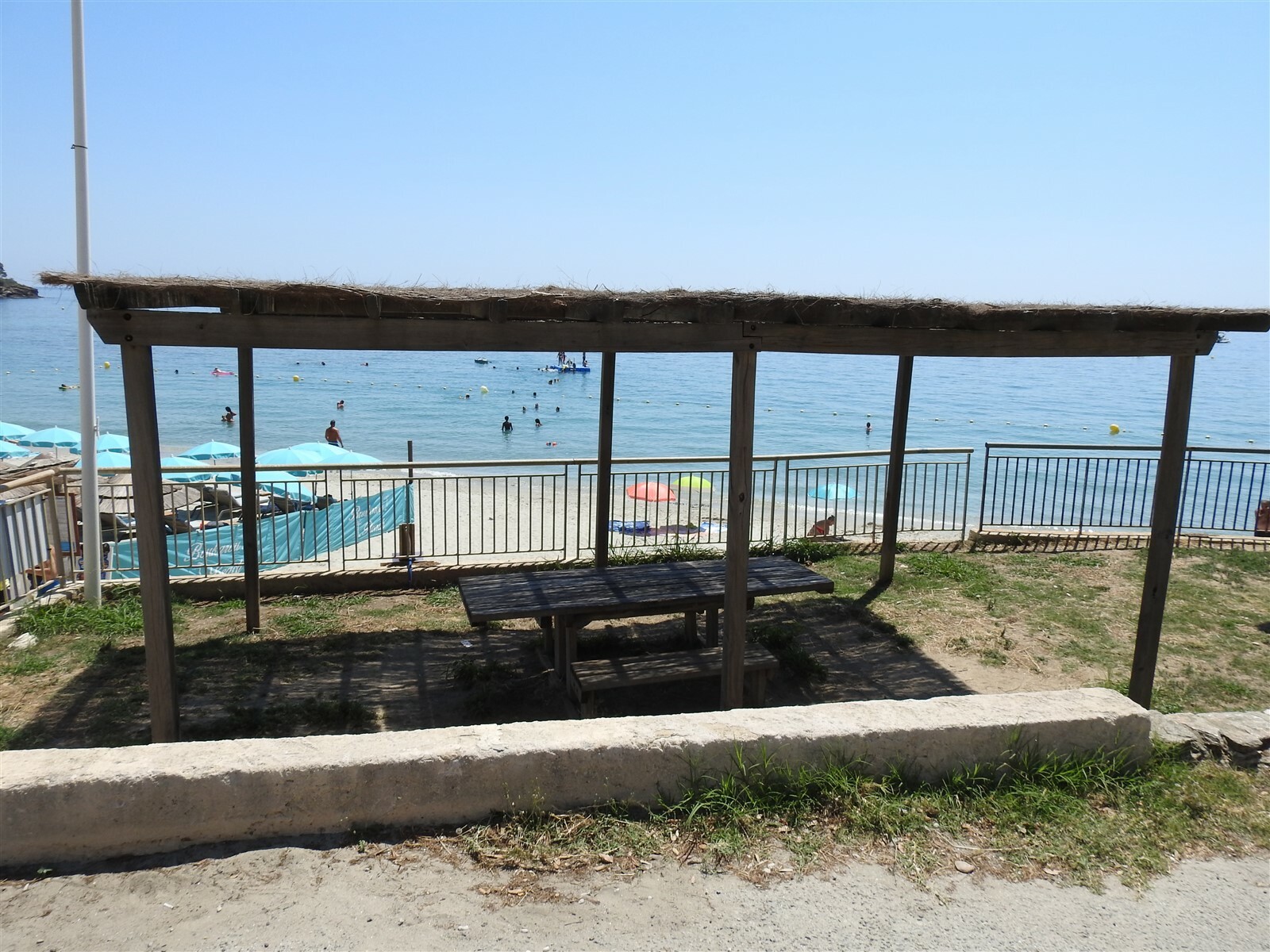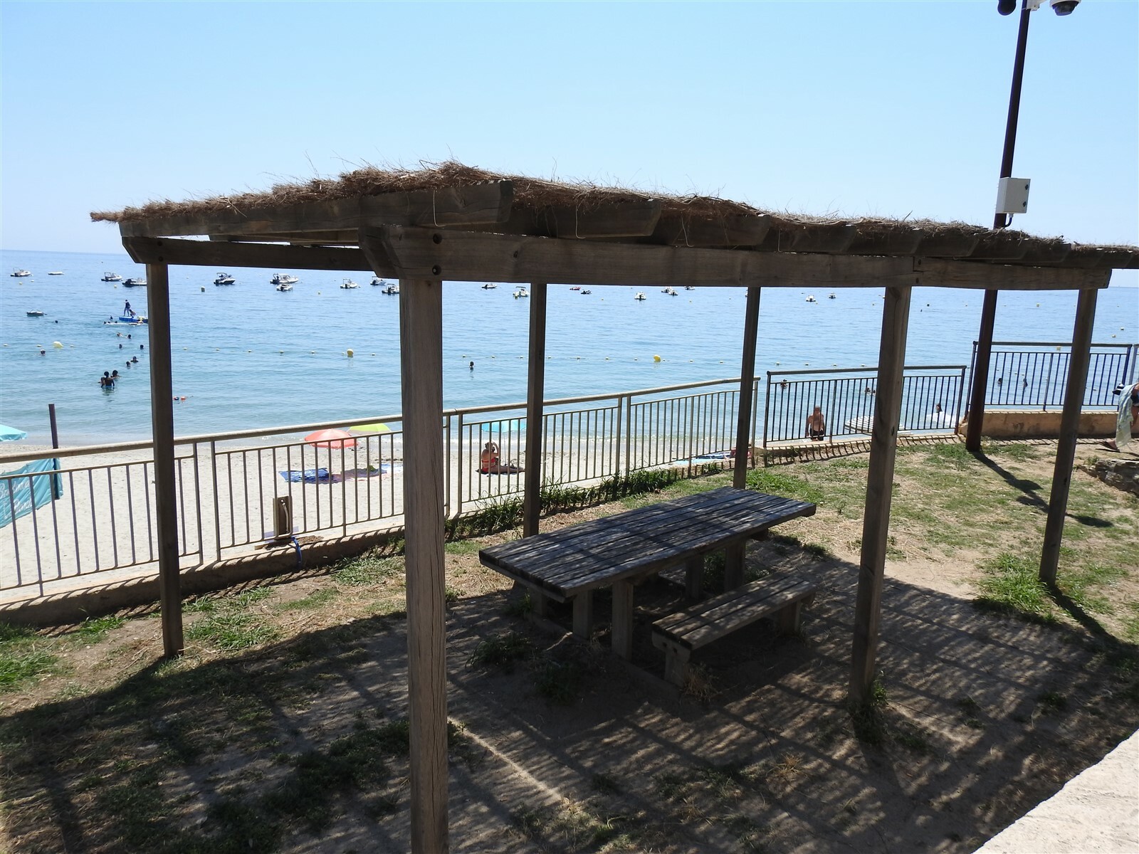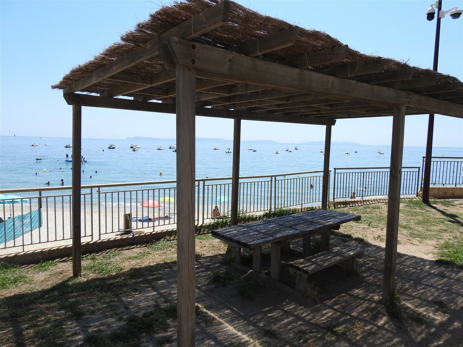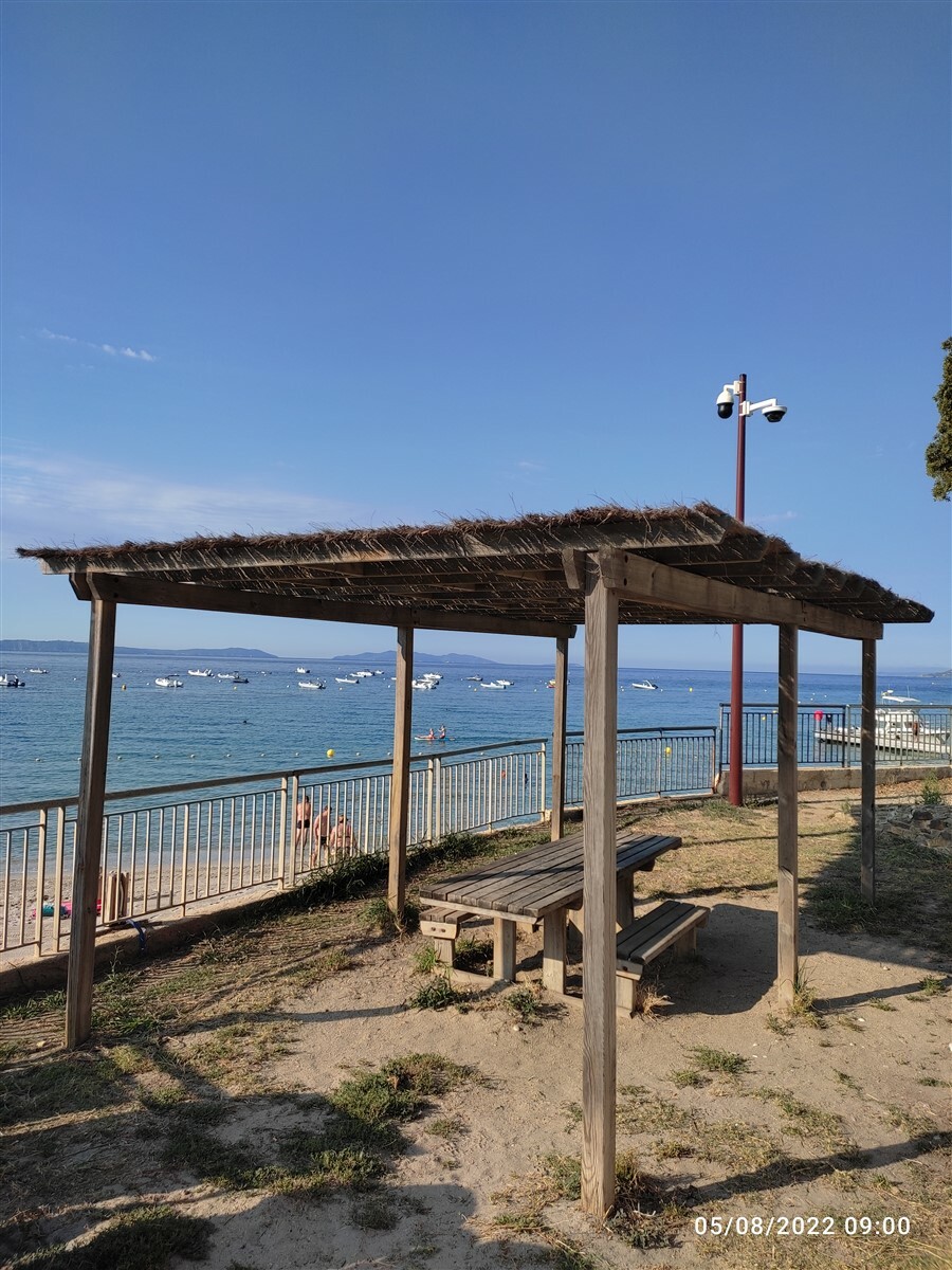 Aire de pique-nique au dessus de la plage Rayol Ouest face à la mer et les îles d'or...table, banc et pergola.