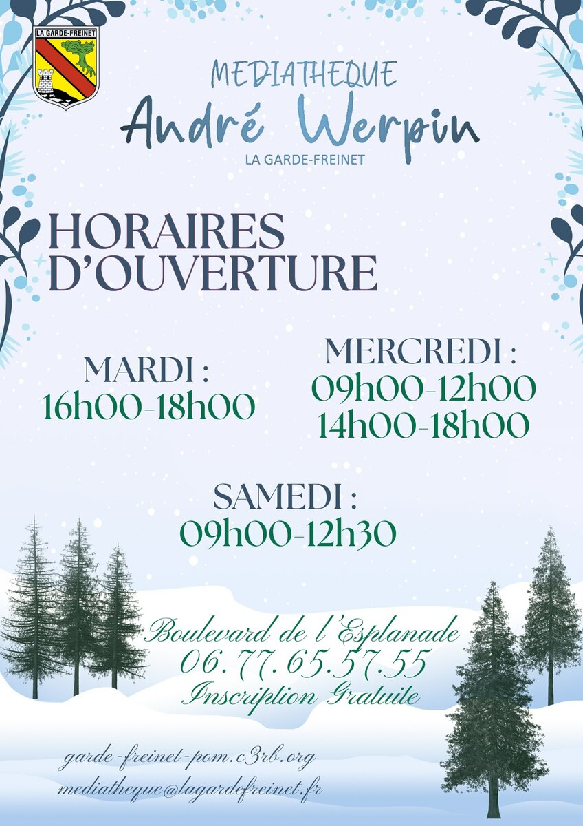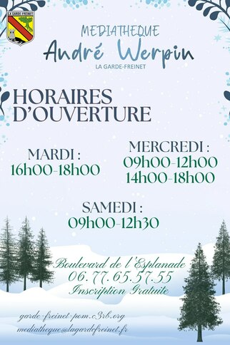 Toute l'année le mardi de 16h à 18h. Le mercredi de 9h à 12h et de 14h à 18h. Le samedi de 9h à 12h30.