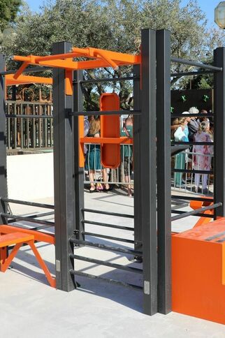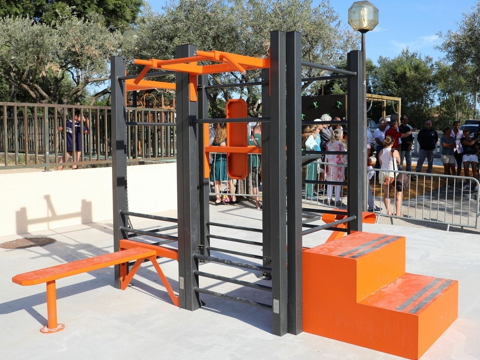 Station de cross-training en accès libre. Banc pour abdominaux, barre de traction, chaînes de suspension... c'est l'occasion de vous retrouver pour vos séances de renforcement musculaire tout en profitant du soleil.