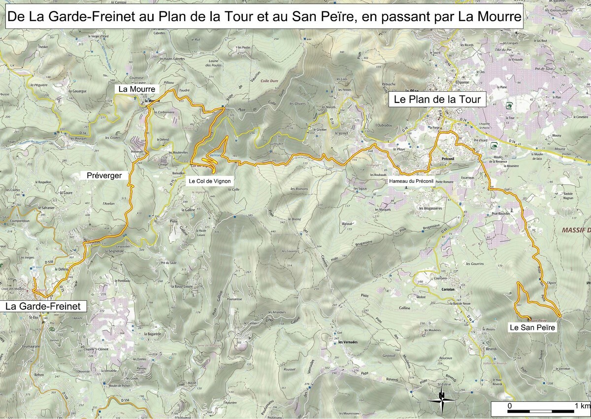 Suivre le descriptif du sentier "Les Gorgues" jusqu'au chemin de la Planète, puis suivre le chemin du Magnan et prendre le chemin de Terre Rouje puis la piste N°E713 ou vous rencontrez des blocs géants de granite gris. L’accès au sommet du San Peire se fait par un petit chemin qui traverse les ruines de l'oppidum. Au sommet un magnifique point de vue vous attends.