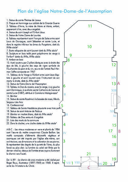 Le chemin de croix de style moderne a été réalisé par Roger Roux en 1968. Les vitraux sont l'oeuvre du maître aveyronnais Claude Baillon.