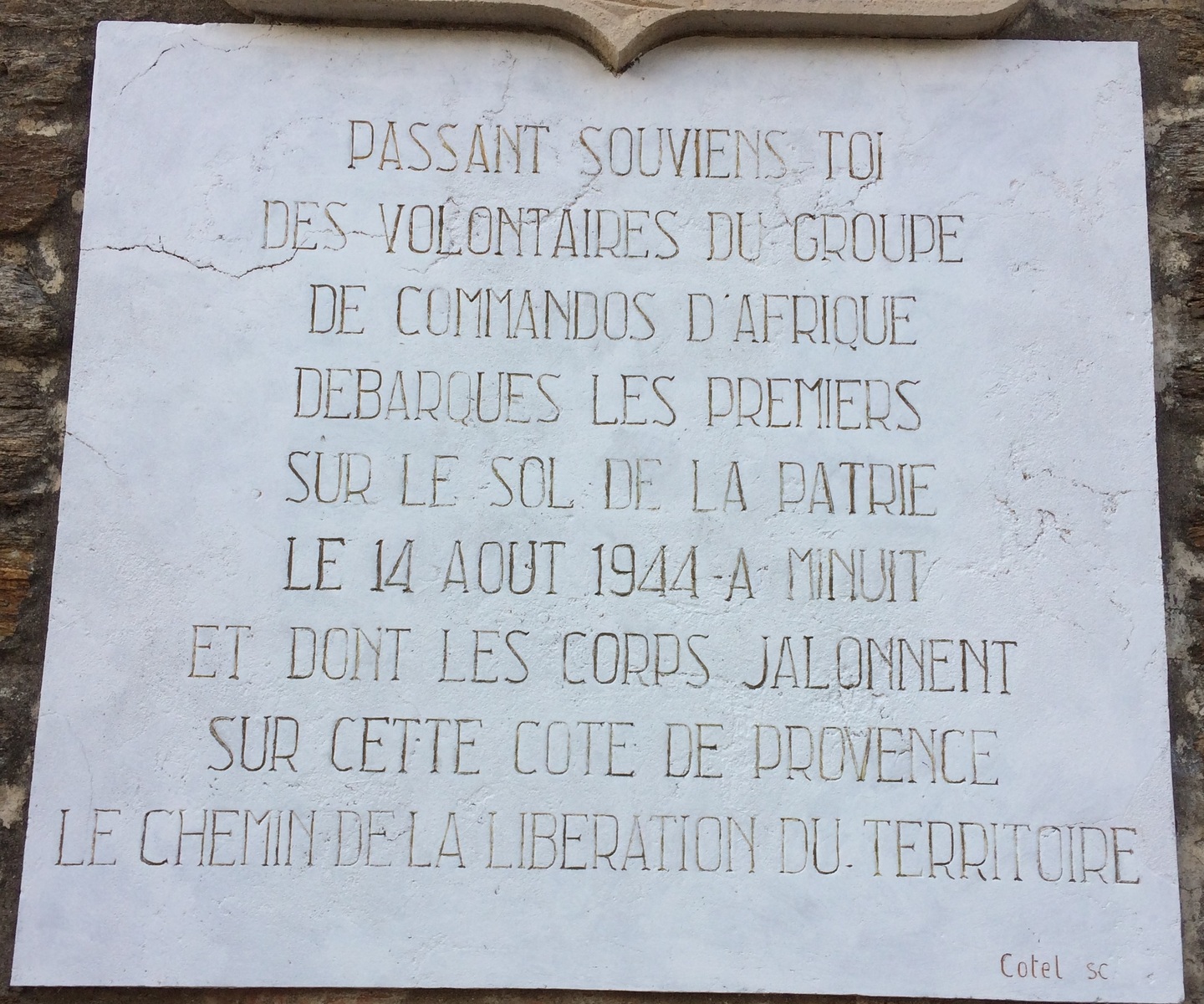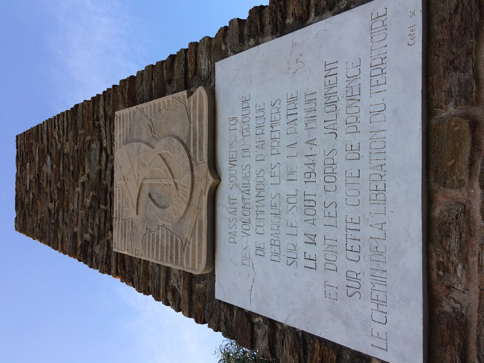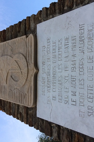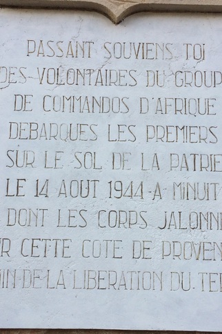 Passant, souviens-toi des volontaires du groupe des Commandos d'Afrique débarqué les premiers sur le sol de la patrie le 14 août 1944 à minuit et dont les corps jalonnent sur cette côte de Provence le chemin de la Libération.
