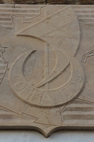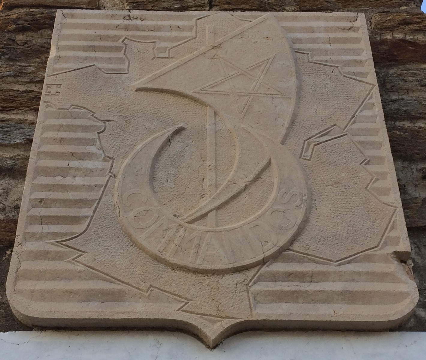Sur la plus haute est gravé l'emblème des Commandos d'Afrique, comportant une carte de France sur laquelle se profile un croissant figurant une barque marquée du mot COMMANDOS, surmonté d'un mât avec une voile frappée d'une étoile à cinq branches.
