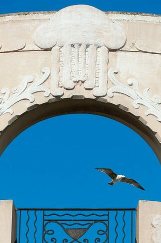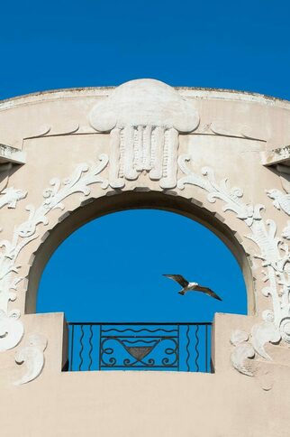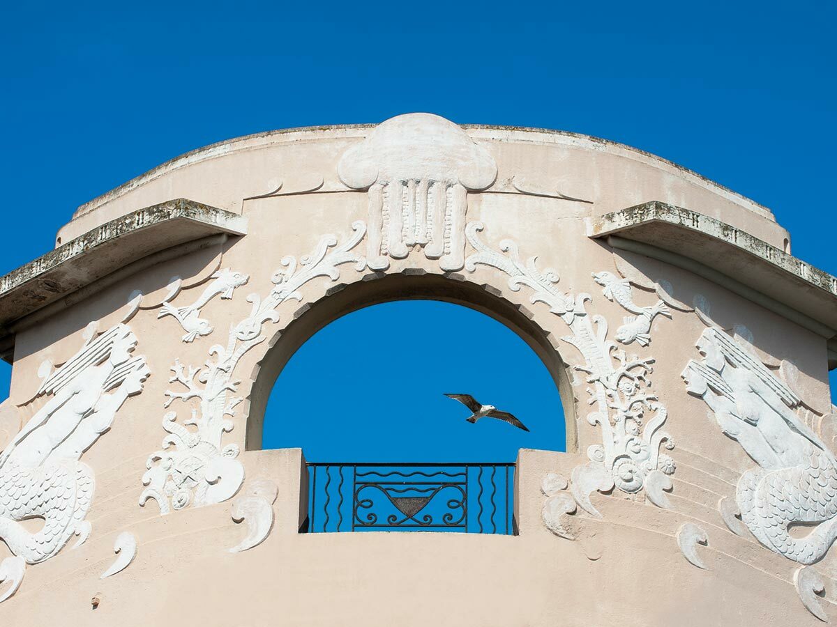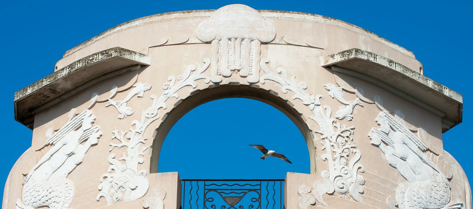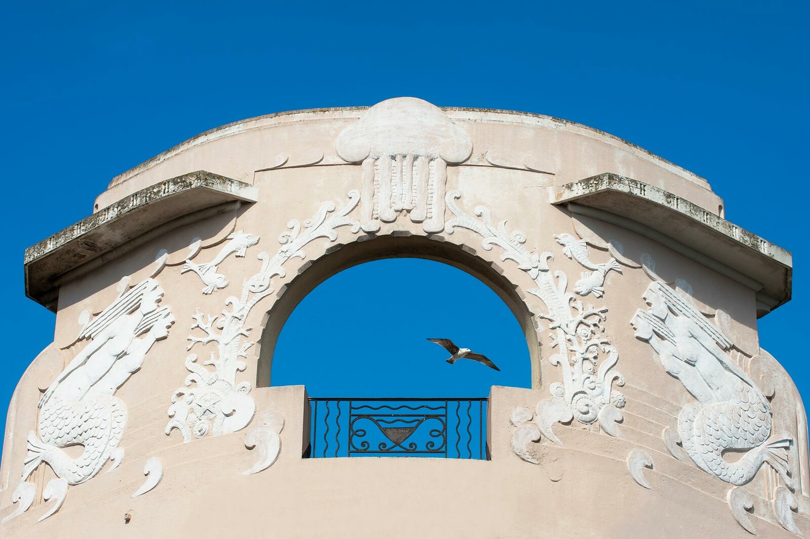 L'immeuble est construit à l'angle de deux rues structurantes de la nouvelle station balnéaire en cours de constitution : l'avenue de la Gare (actuellement Jean-Jaurès) qui reliait la gare à la plage et au casino, et le "boulevard du Littoral". La caractéristique majeure de cet immeuble est le traitement spectaculaire des façades qui joue sur des trompe-l'œil architecturaux, permettant d'en monumentaliser l'angle.Le fronton présente un décor de ciment modelé en bas-relief à motifs maritimes. Quatre sirènes sont situées de part et d'autre de la baie elle-même entourée d'une guirlande d'algues et de coraux où se mêlent de petites crêtes de vagues et des poissons. Le sommet de l'arc est couronné d'une méduse.