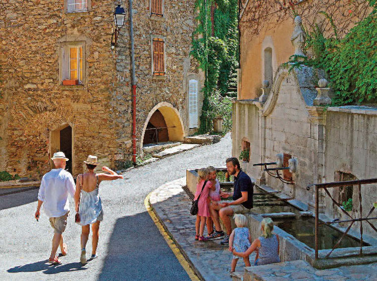 L’eau à la source On connaît l'importance de l'approvisionnement en eau dans tout le pourtour méditerranéen. L'eau est une denrée rare qu'il faut savoir économiser. Il n'est pas loin le temps où on allait chercher de l'eau à la fontaine car l'eau courante ne coulait que chez quelques privilégiés. Tous nos villages disposent de fontaines. L'eau y est généralement fraîche et de bonne qualité. C'était un lieu de sociabilité, les femmes venaient s'approvisionner munies de leur cruche ou de leur seau et on discutait, parfois on se disputait mais on en venait rarement aux mains. Le bétail pouvait aussi venir s'y désaltérer. La fontaine de la place des Lices à Saint-Tropez est la plus célèbre. Elle coule depuis le XVIIIe siècle. A Ramatuelle, Joseph Bernard, maire dynamique en fit construire une sur la place en 1905. A La Garde-Freinet, on trouve la fontaine vieille et une grande fontaine circulaire place Neuve. A Gassin, un puits fournissait l'eau du village. A Grimaud, la fontaine monumentale de la place Neuve est symbole de progrès et de prospérité. Mais au détour d'une ruelle on peut encore apercevoir de vieilles fontaines à bras à Cogolin et Grimaud, ou de modestes bornes à eau du XIXe siècle, signe de modernité et d'hygiène. Il ne faut pas oublier, les fontaines anonymes que l'on rencontre lors d’une randonnée au détour d'un chemin, en plein maquis. Elles sont parfois munies d'un verre ou d'un petit récipient en liège laissé là pour le promeneur afin qu'il étanche sa soif dans les chaleurs de l'été.