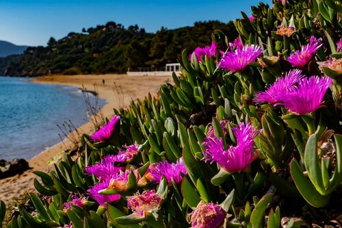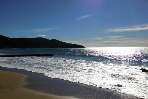 Large plage de sable blanc qui se prolonge en pente douce dans l'eau transparente, partagée en plage privée et littoral public. Possibilité de marches et d'escalades sur les rochers alentours.