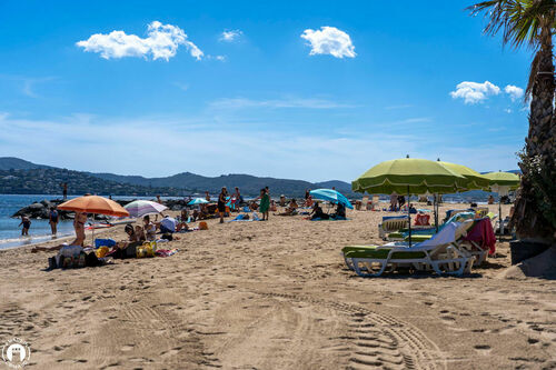 Plage surveillée en été côté Cogolin avec douches, toilettes, restaurants.
