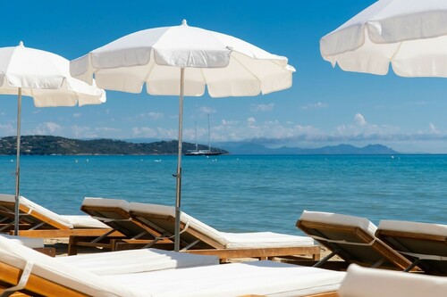 Restaurant des Prairies de la Mer, en bord de mer, avec sa plage privée donnant sur la baie de Saint Tropez. Cocktails, produits frais, transats et parasols .