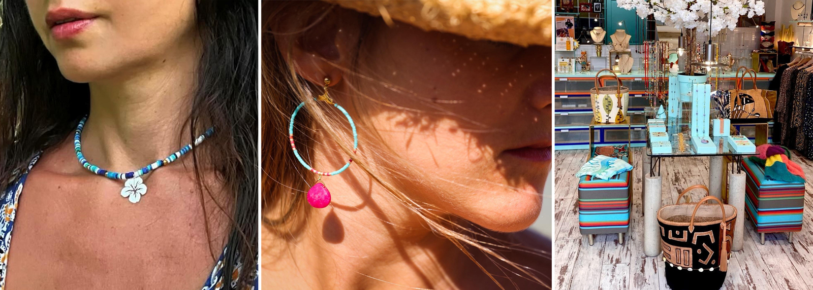 Une boutique joyeuse et lumineuse, où se mêlent bijoux faits main, sacs, vêtements et pièces uniques.