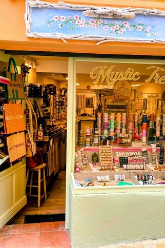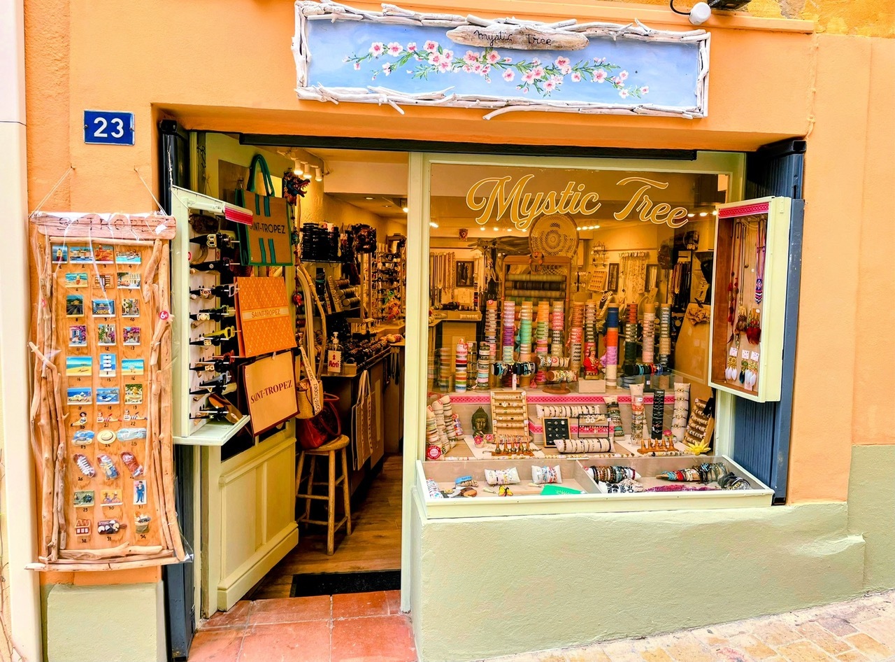 La petite boutique "Mystic" de St Tropez ; un lieu atypique où se mêlent bijoux fantaisie, tuniques et accessoires de mode dans un esprit néo-ethnique.