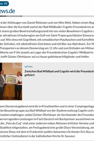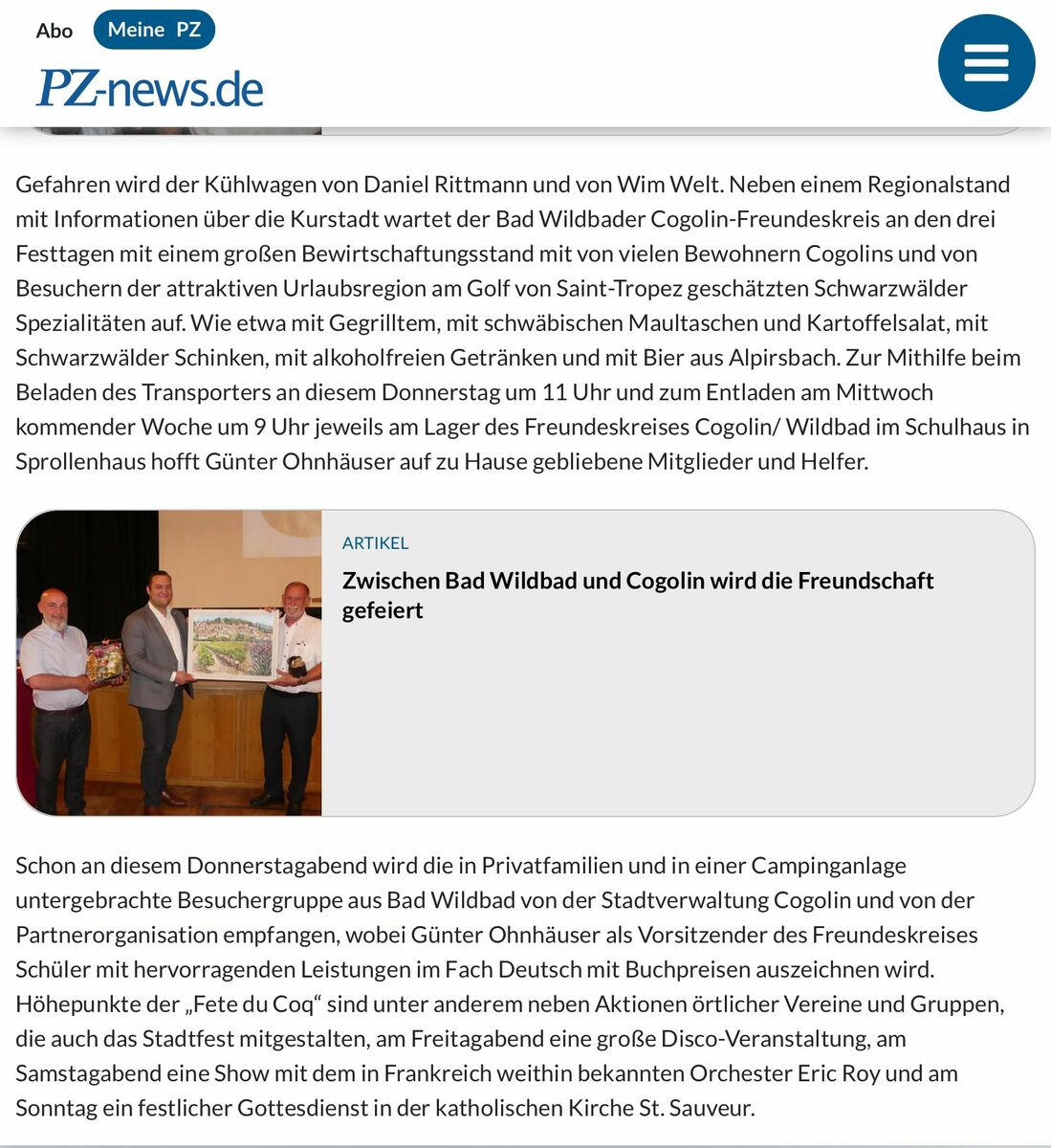 Jumelée avec la ville de Bad Wildbad en Forêt Noire depuis 1981, le comité de jumelage participe tous les ans au début juillet à la "Sommerfest". Nos amis Wildbadois sont également présents pour la "Fête du Coq" de fin août/début septembre à Cogolin.Tous les ans, nous organisons en commun la randonnée du jumelage sur 3 jours consécutifs. Celle-ci se déroule par alternance en France ou en Allemagne.