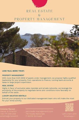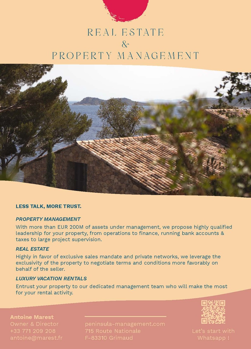 Artisans discrets et efficaces de votre style de vie, PENINSULA PROPERTY ADVISORS est spécialisé dans l'administration (front office / back office), la gestion de projet, la finance et le reporting, la conciergerie, la location et les services spéciaux pour des propriétés de prestige.Gestion immobilière haut de gamme à Saint-Tropez et dans la région de Grimaud, proposant des services immobiliers confidentiels.