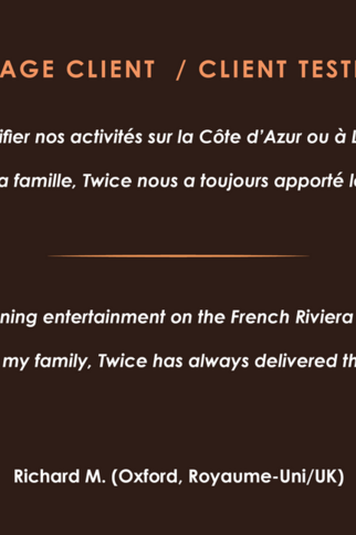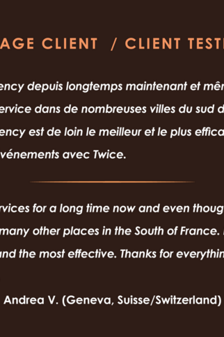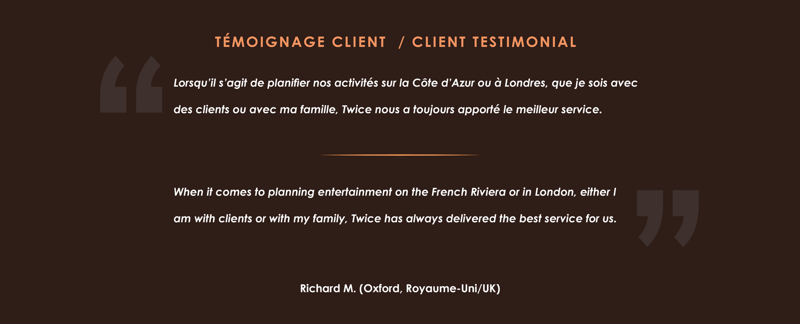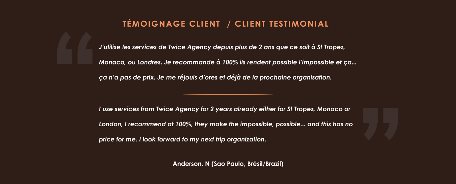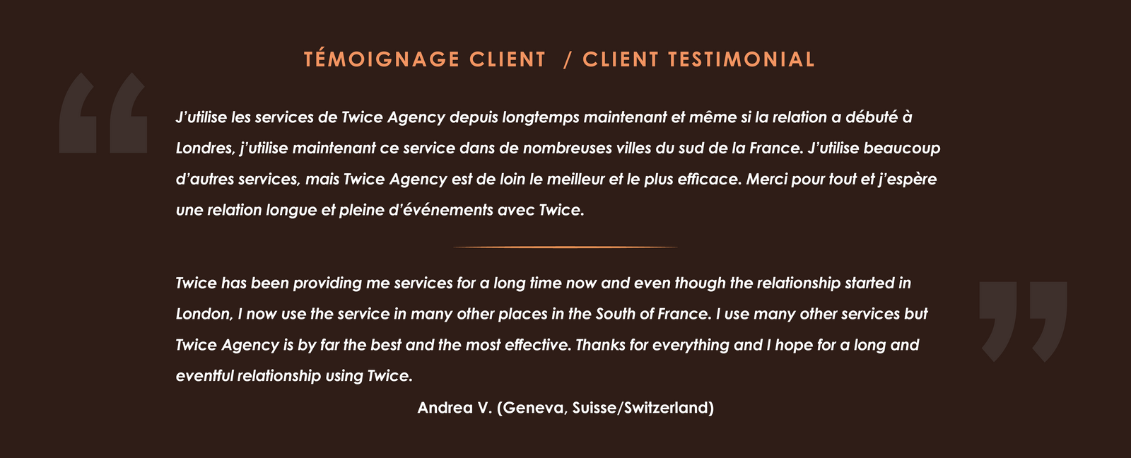 Fondée par Damien Martinez, expert en hospitalité de luxe, conciergerie privée et management événementiel, Twice Agency bénéficie d’un important réseau et de fortes relations de partenariat permettant à nos clients d’accéder aux lieux les plus exclusifs et haut de gamme de la Côte d’Azur et de Londres.