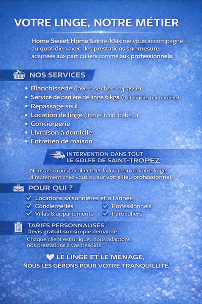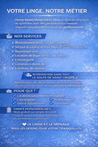 Nous proposons un service de blanchisserie, de location de linge de maison et de puériculture, ainsi qu'un service de livraison.Nous intervenons pour répondre à tous les besoins de nos clients. Nous proposons également des services de blanchisserie, de location de linge de maison et de matériel de puériculture, ainsi qu'un service de livraison.