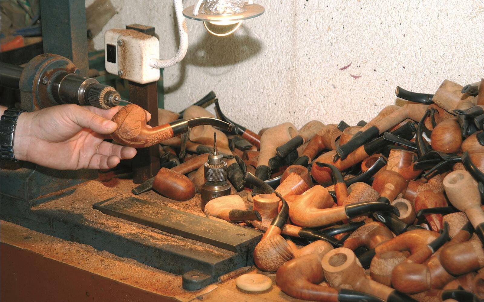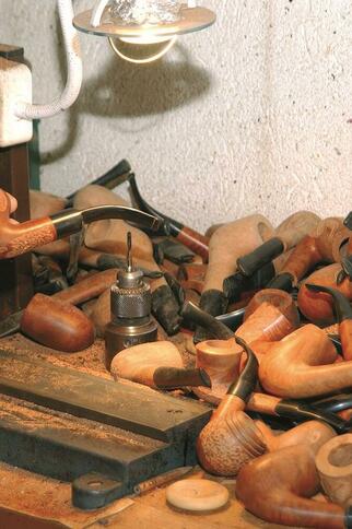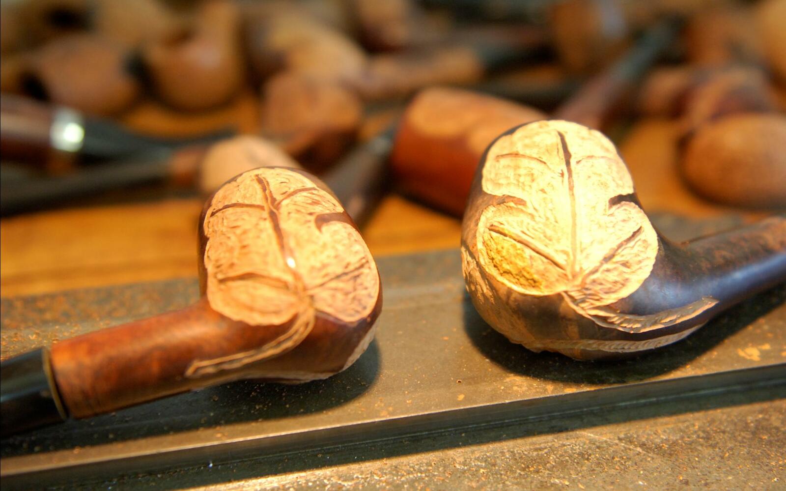 Fabrication de Pipes en racine de bruyère. Entreprise du patrimoine vivant. Pipes sculptées. Grand choix de stylos et briquets "St-Dupont".