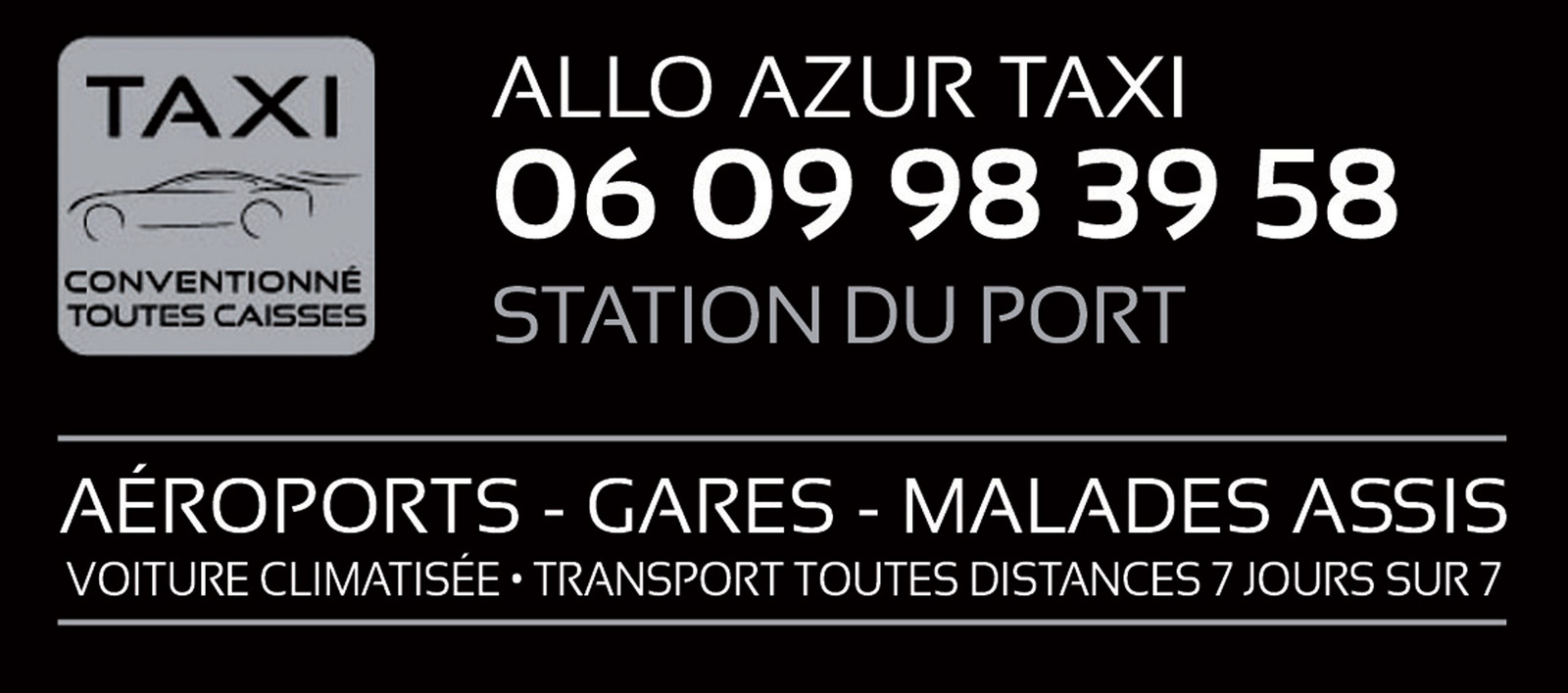 Allo Azur Taxi apporte un service soigné de qualité et assure un confort optimal dans ses véhicules récents (vans, voitures climatisées) et à votre disposition tous les jours de la semaine, pour des déplacements faciles, rapides, confortables, et surtout en toute liberté. Transports toutes distances : ils assurent tous vos déplacements quelles que soient leurs distances ou durées. Gares et aéroports : communiquez votre heure d’arrivée, il vous accueilleront personnellement à la gare ou à l’aéroport.