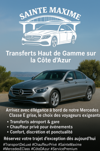 Sainte-Maxime Transferts est votre partenaire de confiance pour tous vos déplacements privés sur la Côte d’Azur. Nous proposons un service de transport haut de gamme, alliant confort, ponctualité et discrétion. Que ce soit pour un transfert vers les aéroports, les gares, les ports ou les principales destinations touristiques de la région, nos chauffeurs professionnels et expérimentés vous garantissent un trajet agréable à bord de véhicules élégants et parfaitement entretenus. Profitez d’une expérience de transport sur mesure, adaptée à vos besoins personnels ou professionnels, avec une attention particulière portée à la qualité de service.