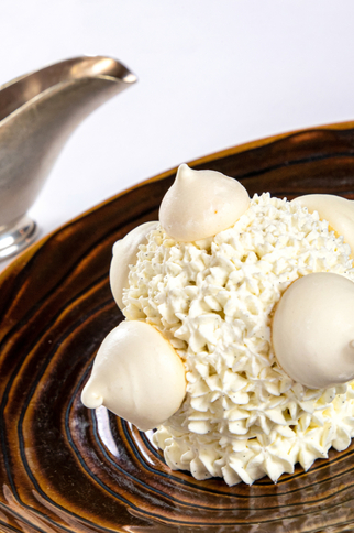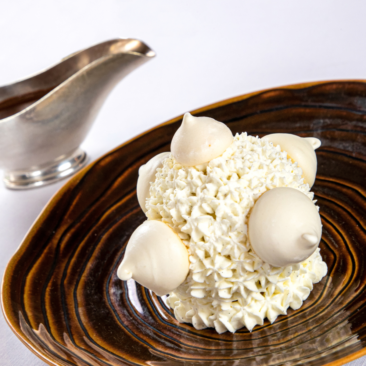 Dessert : baba au Ron Santiago 8ans, meringue glacée à la vanille de Madagascar , chocolat chaud