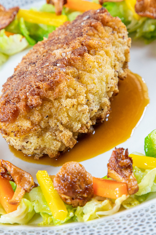 Plat : l'agneau de Sisteron rôti au thym sauvage, ris de veau rôti aux petits croûtons et jus de veau corsé à la carotte, poissons de nos côtes de pêcheurs