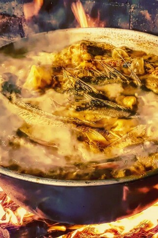 Spécialités bouillabaisse cuite au feu de bois, poisson, langouste, homard.