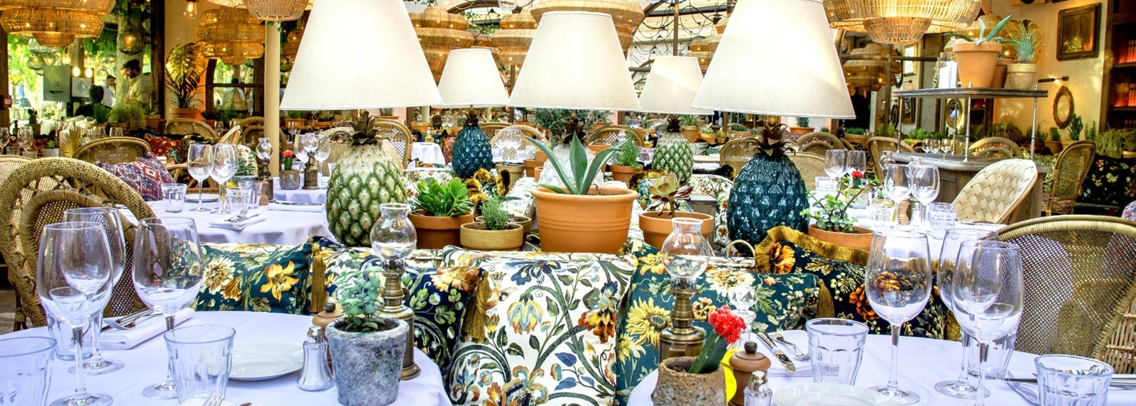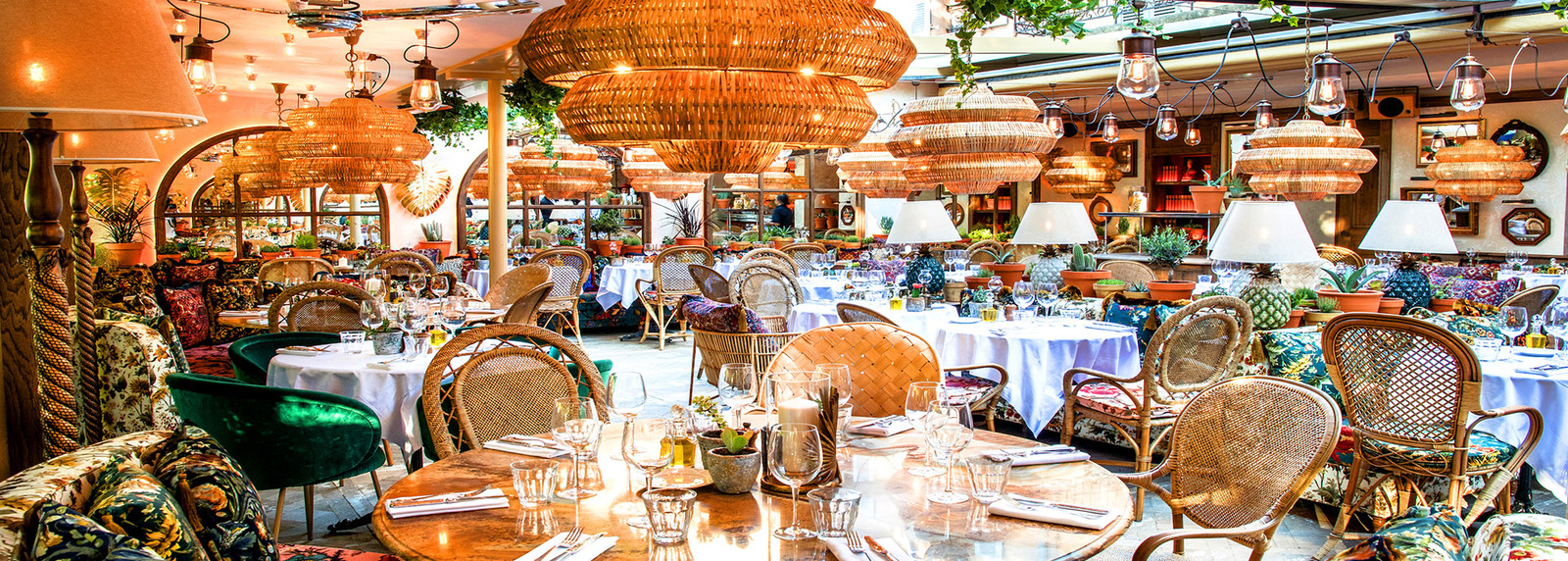 La charmante terrasse arborée vous accueille au déjeuner et au dîner, bercée par les cigales face au spectacle des joueurs de pétanque. A l’intérieur, la décoration luxuriante et authentique laisse place aux tissus moirés aux imprimés floraux, aux patines et au bois. De midi à minuit, la carte propose une ribambelle d’assiettes aux accents provençaux. Et à la nuit tombée, place à l’ambiance piano-bar et à la variété́ française.