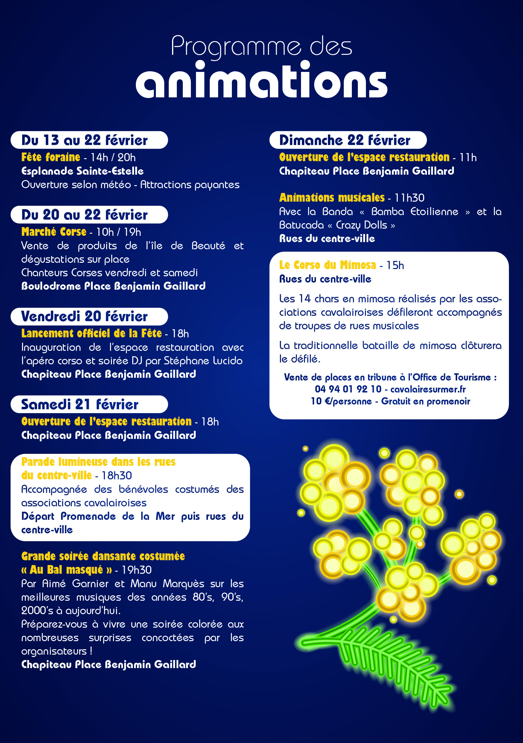 - À Sainte-Maxime : le Corso du Mimosa célèbre la beauté éphémère de cette fleur emblématique, avec 10 chars fleuris par les associations maximoises, accompagnés de groupes musicaux, spectacles déambulatoires et personnages costumés, le dimanche 1er février. Un événement incontournable de l’hiver dans l’univers « Les époques à travers le temps » pour l’édition 2026.
